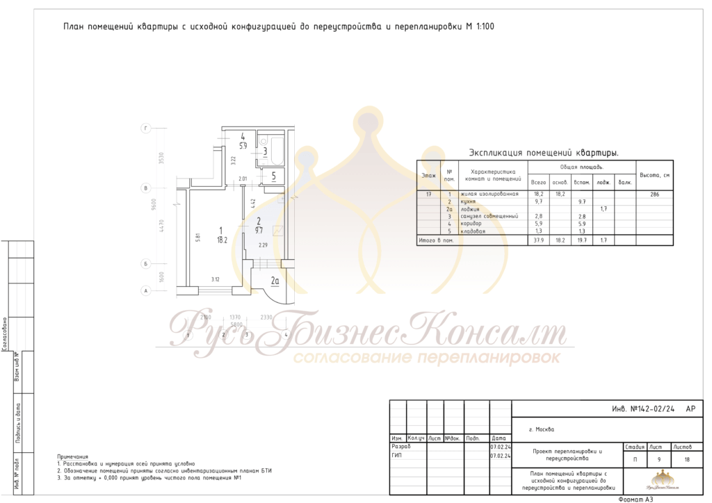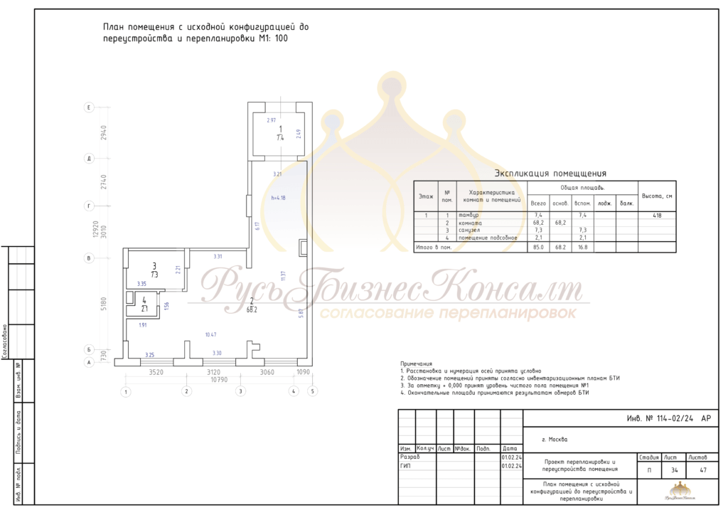 1.4.2. План помещения с указанием исходной конфигурации помещения до переустройства и (или) перепланировки с экспликацией в масштабе М 1:100 (М 1:50).